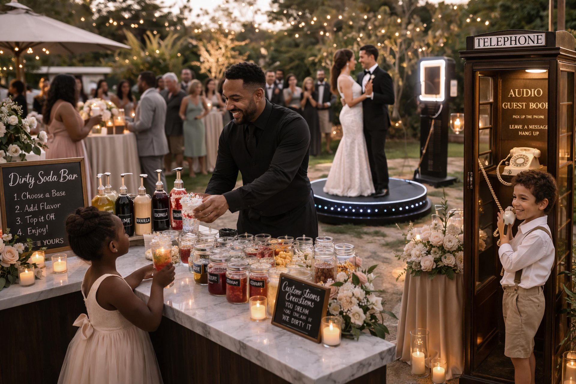 Mobile bartending, 360 photo booths, mocktail & dirty soda stations, & audio guest books.